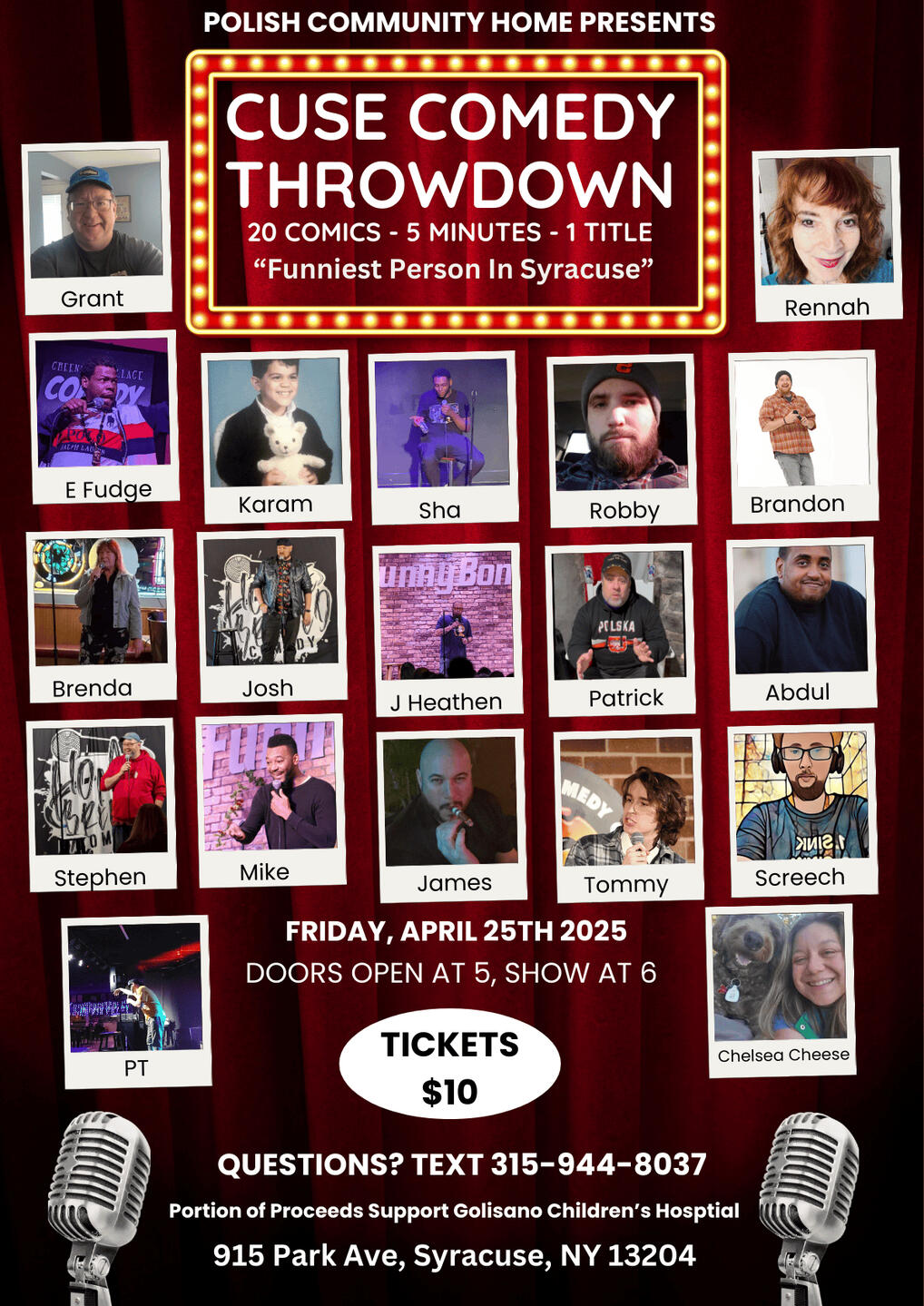Join us for a feel good night of laughs. 20 of the best amateur comics in Upstate New York will each perform for 5 minutes and compete for a grand prize of $250 and the title belt of "Funniest Person in Syracuse". An all star panel of judges will ensure that every comic gets their fair shake at the crown. Generously hosted by the Syracuse Polish Community Home (POHO) - it will be an eventful evening of food,drinks & laughs. A portion of the proceeds will be donated to Golisano Children's Hosptial